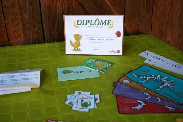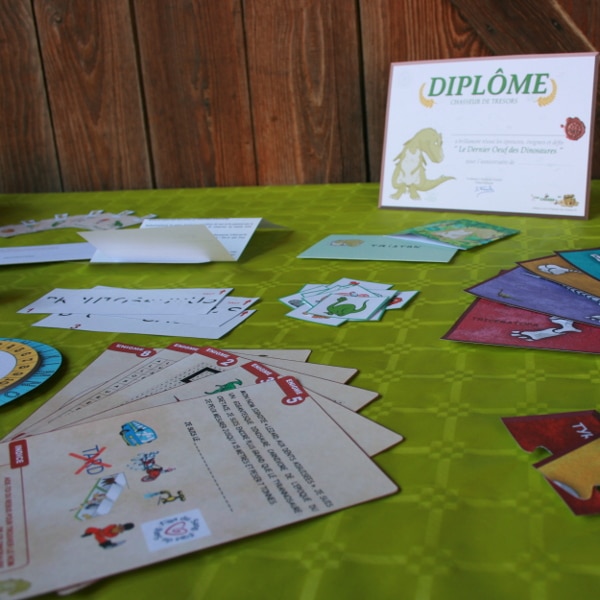 On our website dedicated to printable treasure hunts for kids, we offer ready-to-use dinosaur adventure games that you can download instantly and print at home. From invitations and decorations to diplomas and explorer accessories — and of course the game itself (fossil searches, riddles, maps, and prehistoric challenges) — everything is included in the kit to host over two hours of immersive play, indoors or outdoors, for children aged 4 to 10.